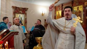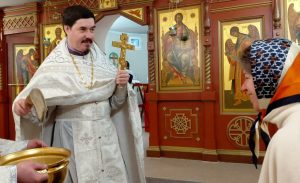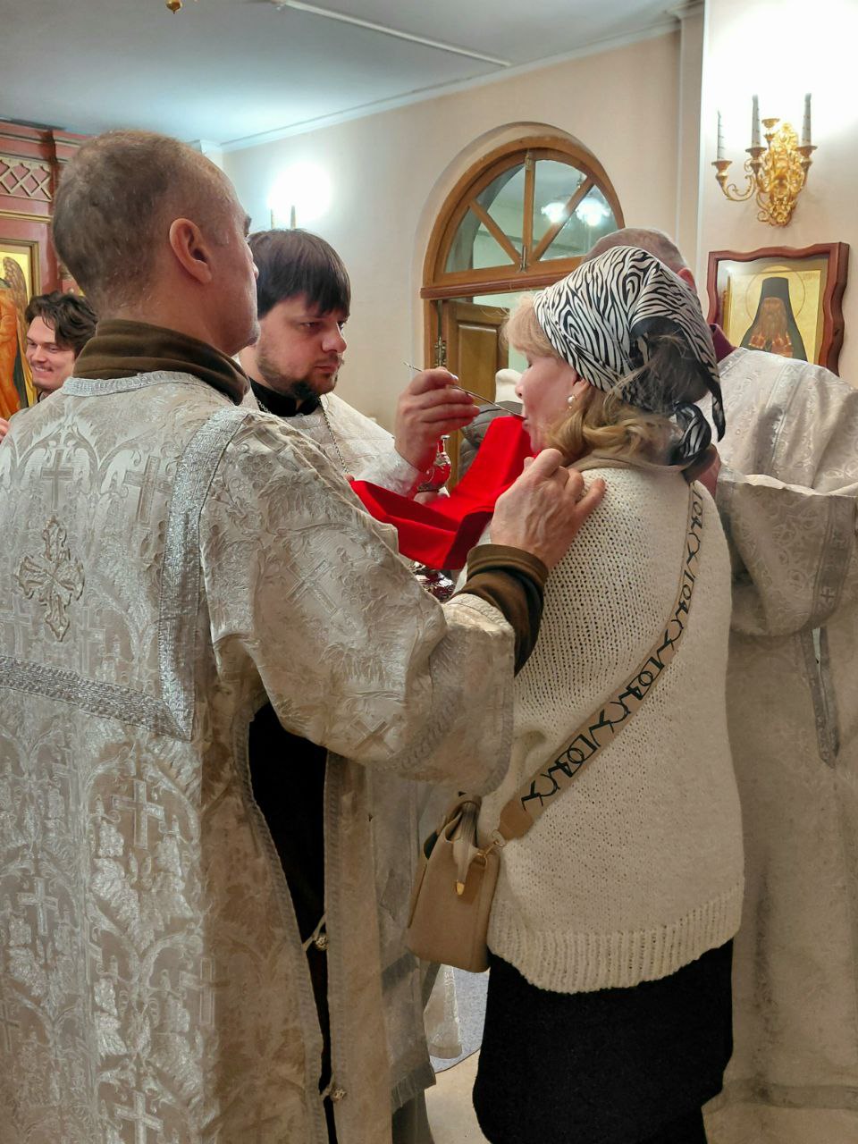 По заамвонной молитве при пении тропарей «Глас Господень на водах» отец Дионисий совершил Чин великого освящения воды, после которого окропил верующих святой водой.