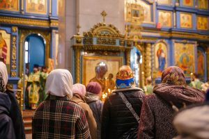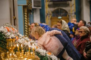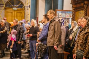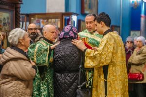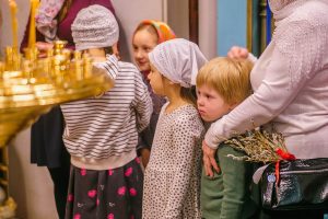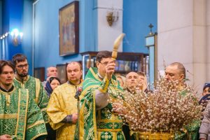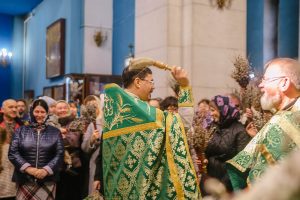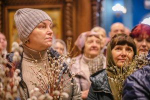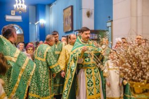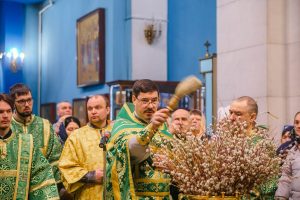 По окончании Божественной литургии отец Дионисий прочитал молитву на освящение ваий, а затем окропил святой водой принесенные верующими ветви вербы.