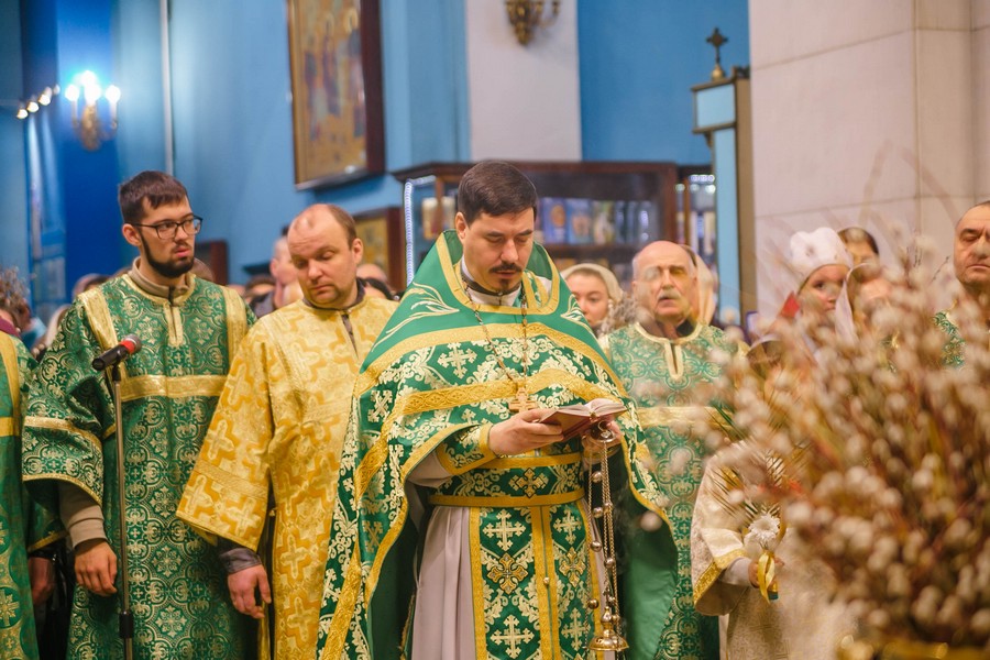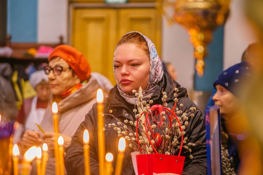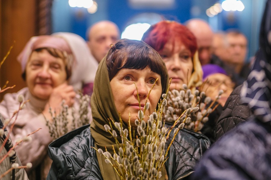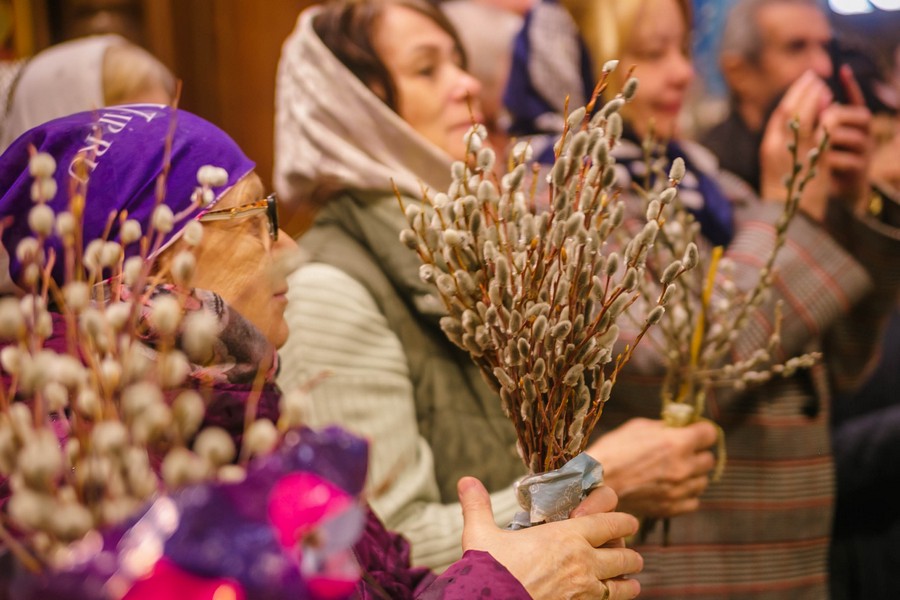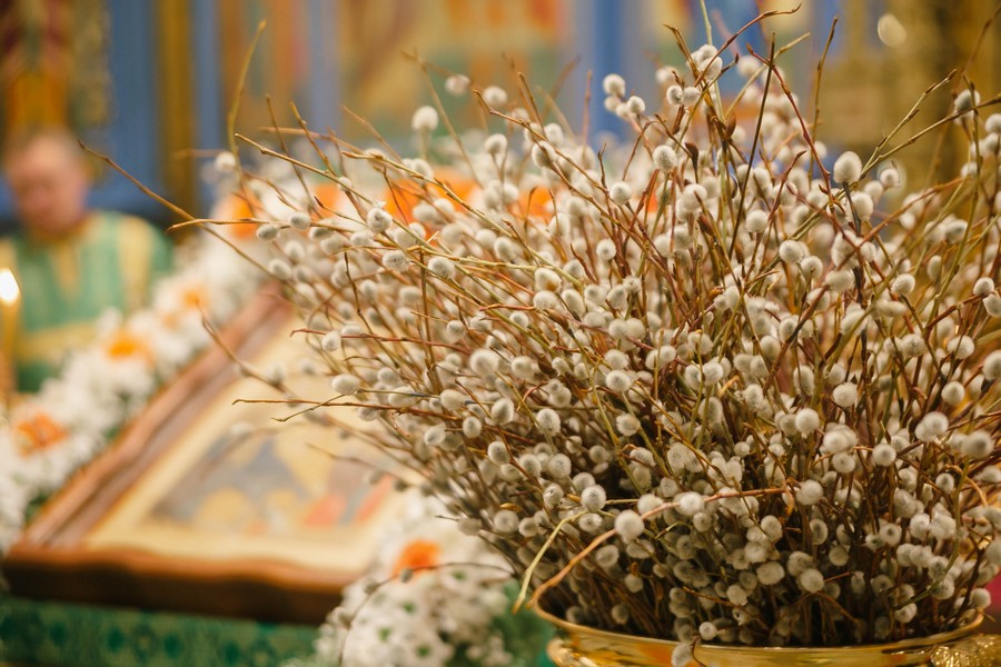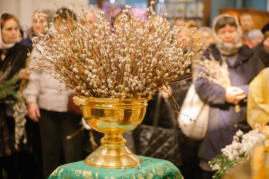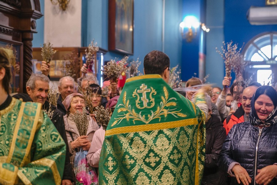По окончании Божественной литургии отец Дионисий прочитал молитву на освящение ваий, а затем окропил святой водой принесенные верующими ветви вербы.