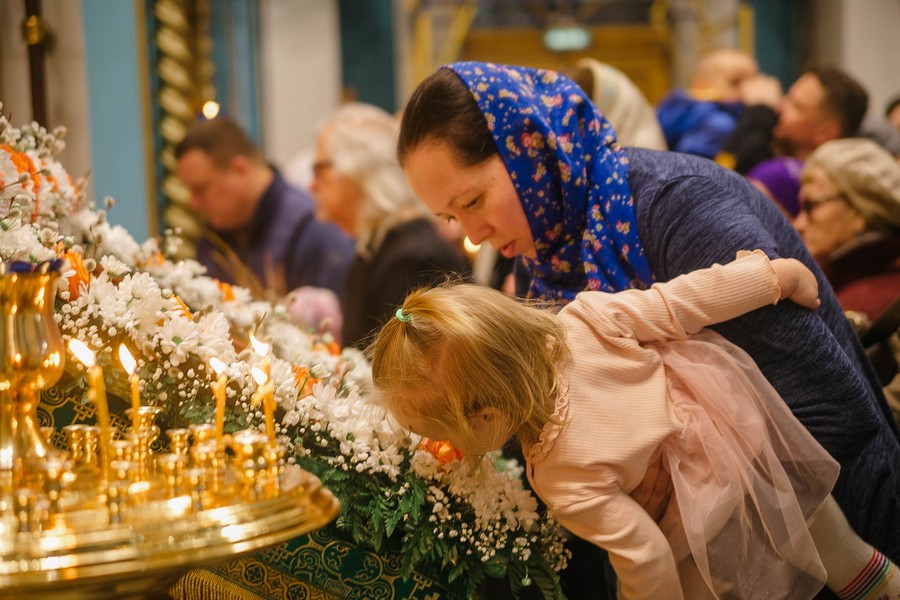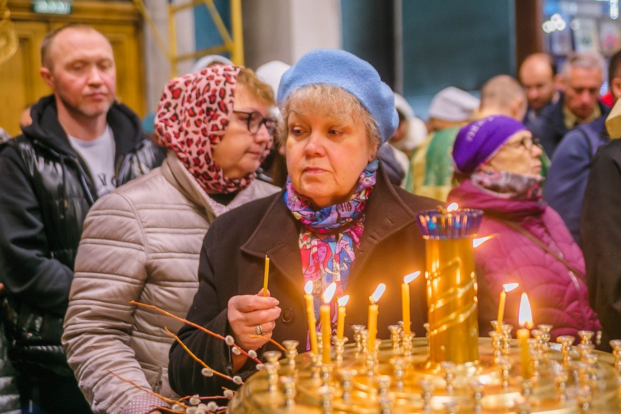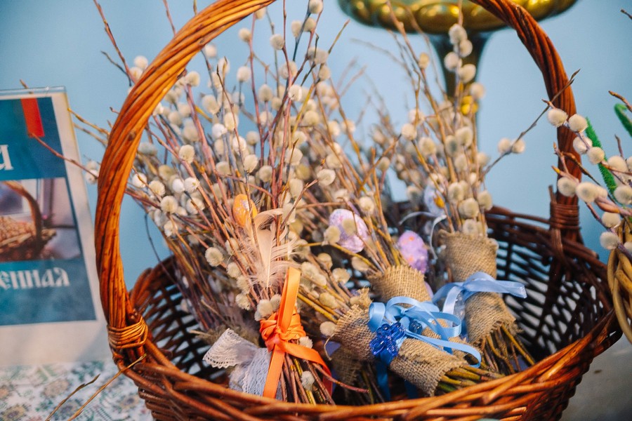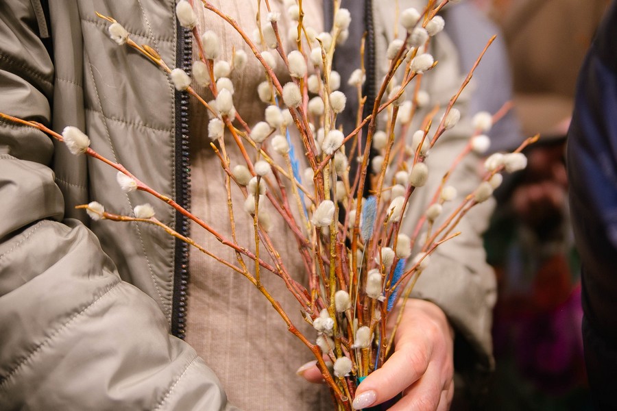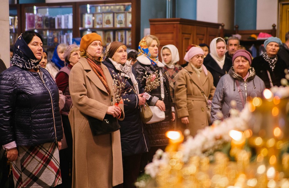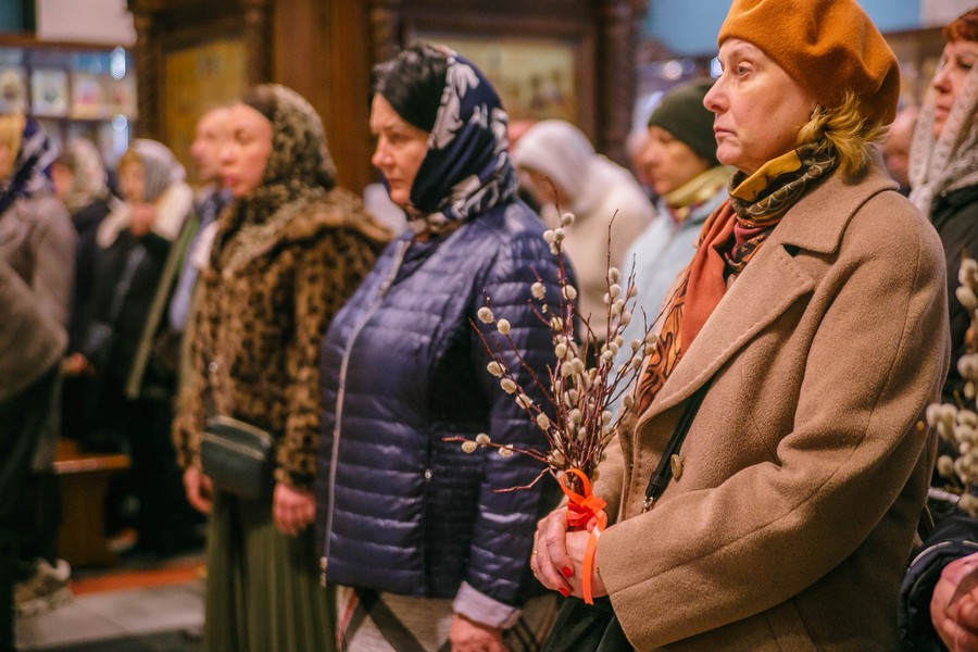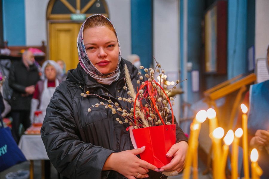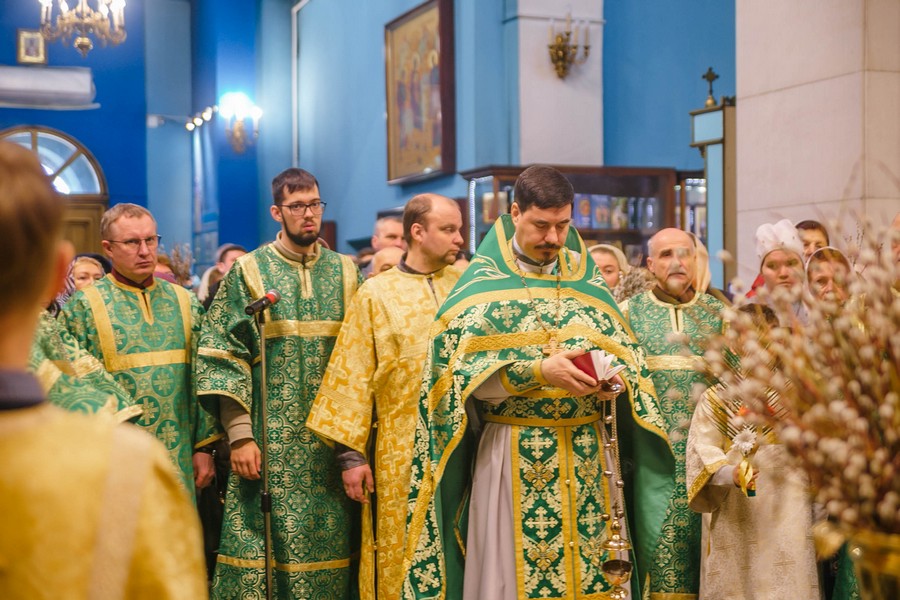По окончании Божественной литургии отец Дионисий прочитал молитву на освящение ваий, а затем окропил святой водой принесенные верующими ветви вербы.
