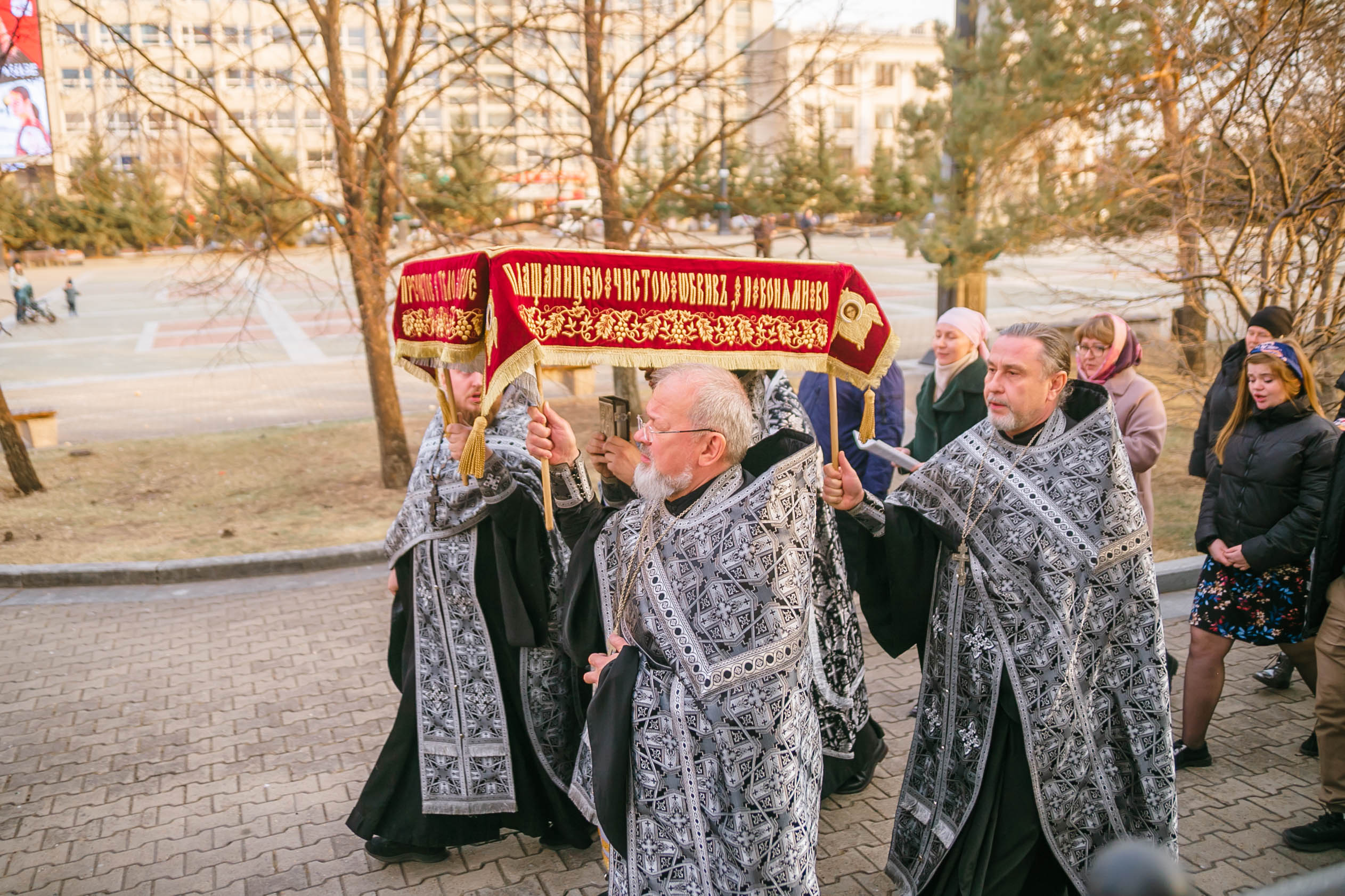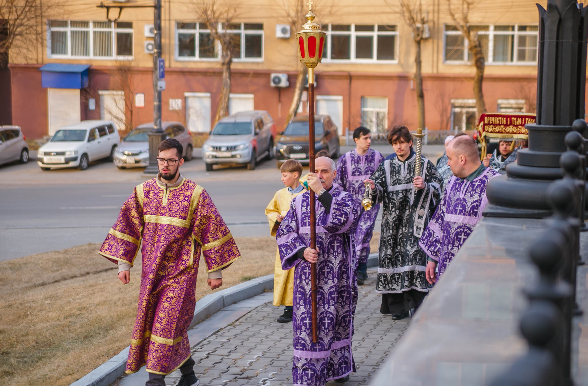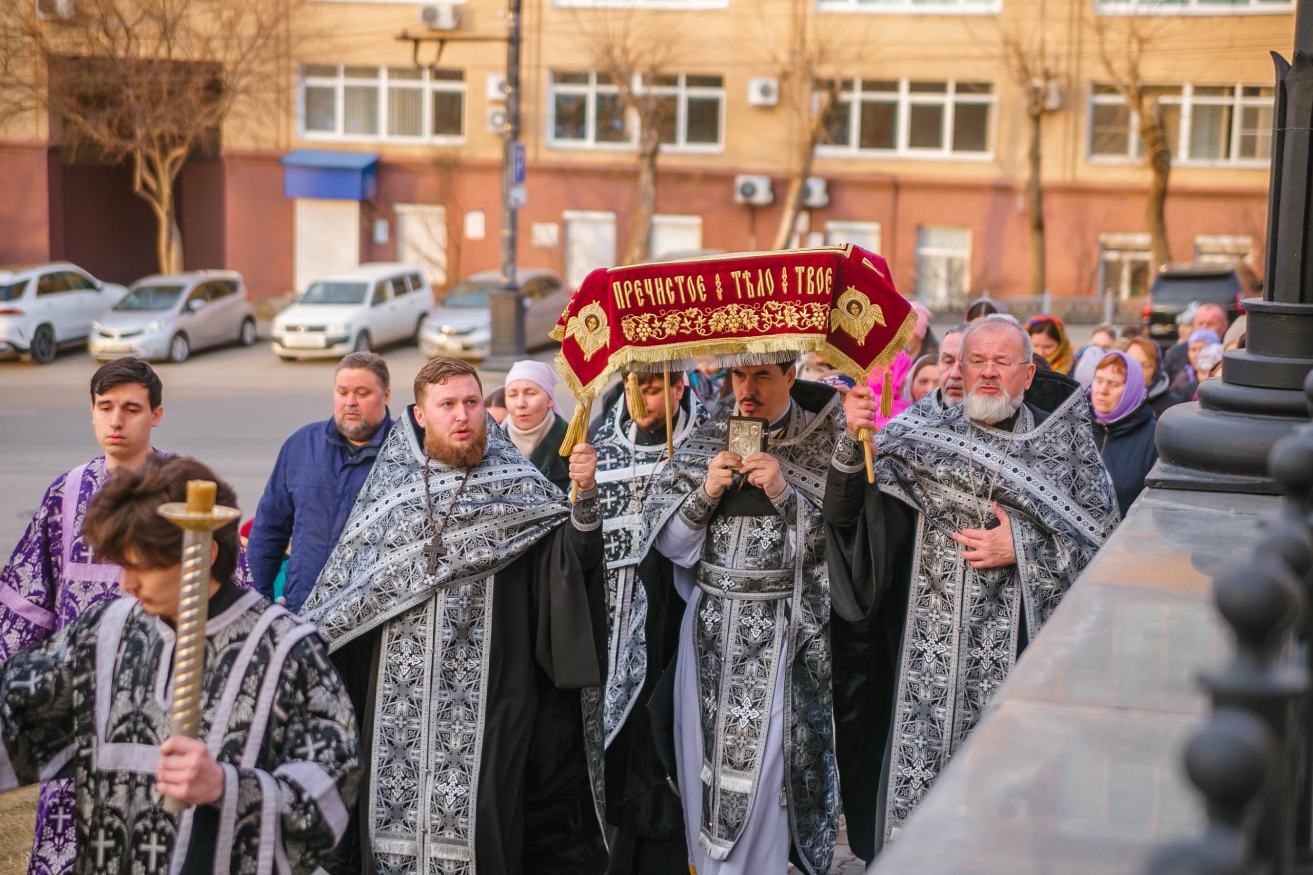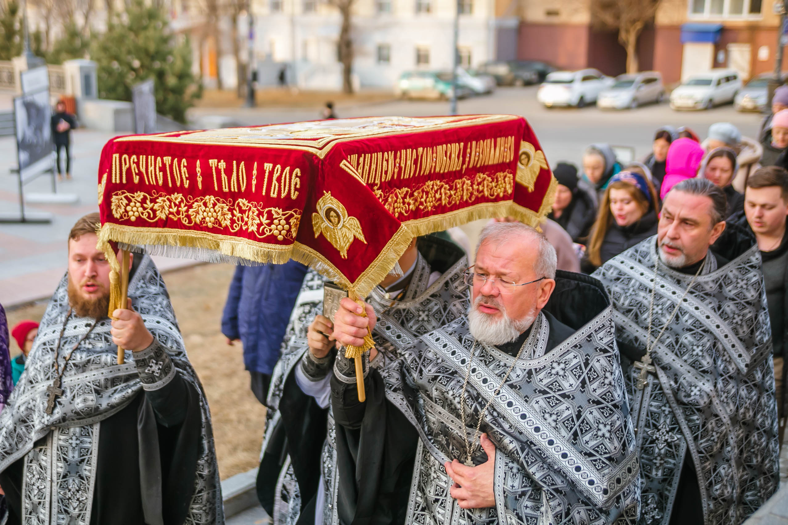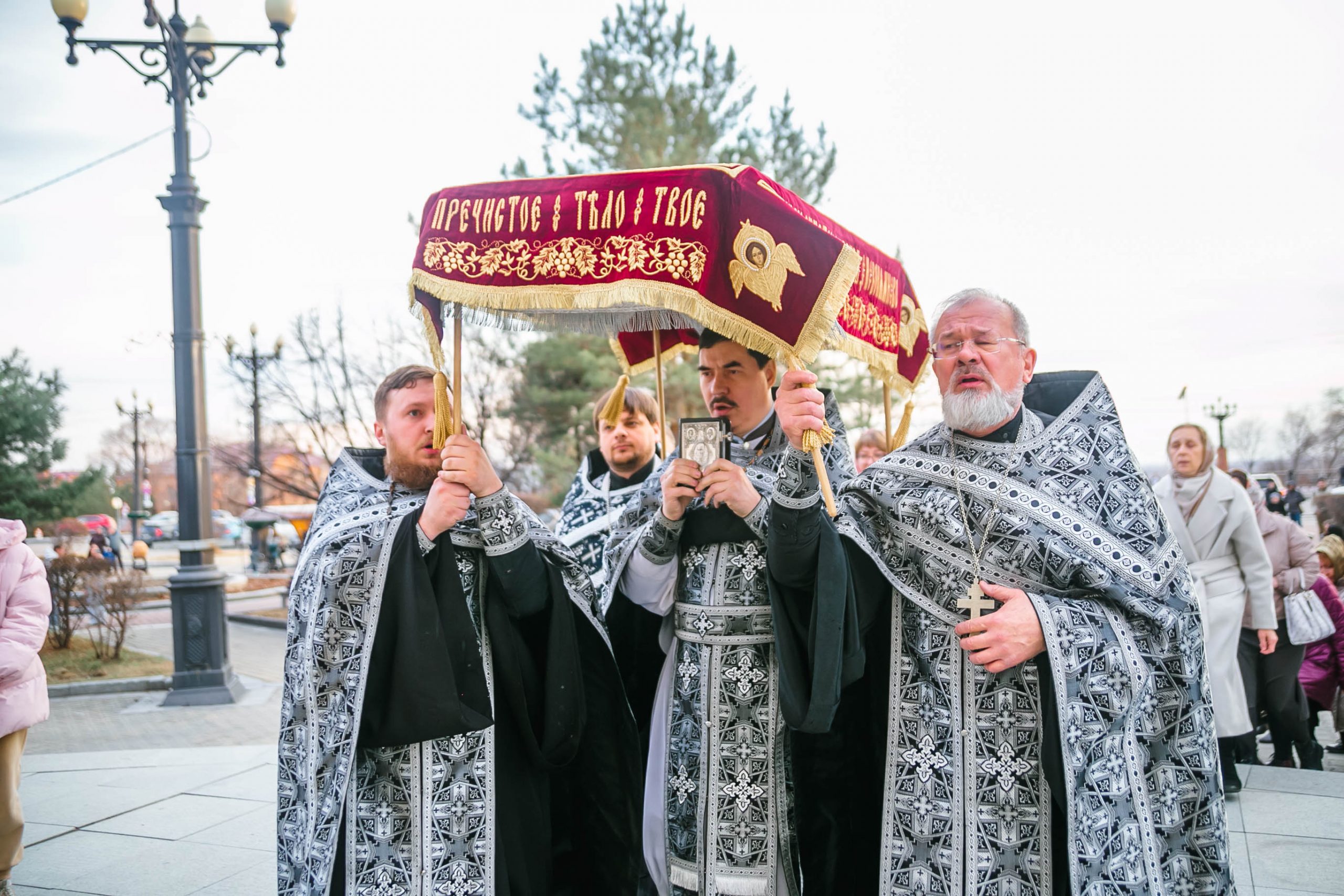10 апреля 2026 года, в Великую пятницу, в Градо-Хабаровском соборе Успения Божией Матери состоялось Вечернее богослужение с выносом Плащаницы Спасителя и Чином погребения.
