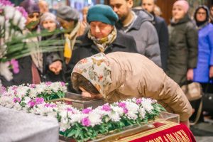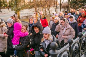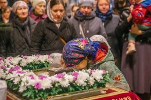 По окончании Великого славословия с пением погребального «Святый Боже» священники и многочисленные миряне совершили крестный ход с Плащаницей вокруг Успенского собора. После этого Плащаницу поднесли к Царским вратам, а затем возложили в центр храма.